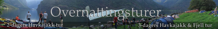 2 dagers guidet havkajakk tur  all mat inkludert En to dagers en-vei havkajakk tur med overnatting i telt. Vi padler gjennom hele Nærøyforden og kommer inn i Aurlandsfjorden. Masser av tid for å oppleve og slappe av. Vi har tilbudt vår 2 dagers tur siden vi startet opp i 1998. Alltid en vinner!